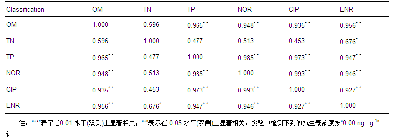 本研究中(表 1和表 2),3種FQs與OM、TP間呈極顯著正相關(guān).S9點(diǎn)位OM含量最高,沉積物中的OM蘊(yùn)含物質(zhì)復(fù)雜多元,F(xiàn)Qs進(jìn)入水體后會(huì)迅速被吸附,因此S9點(diǎn)位測(cè)得的3種FQs也最高,這與張勁強(qiáng)等的研究也相符合.Carrasquillo認(rèn)為FQs有很強(qiáng)烈的吸附固相,能夠強(qiáng)烈吸附在顆粒物和沉積物中(Carrasquillo et al., 2008),可見FQs與沉積物間的相互吸附作用強(qiáng)烈,也可以解釋FQs在沉積物中含量高的原因.