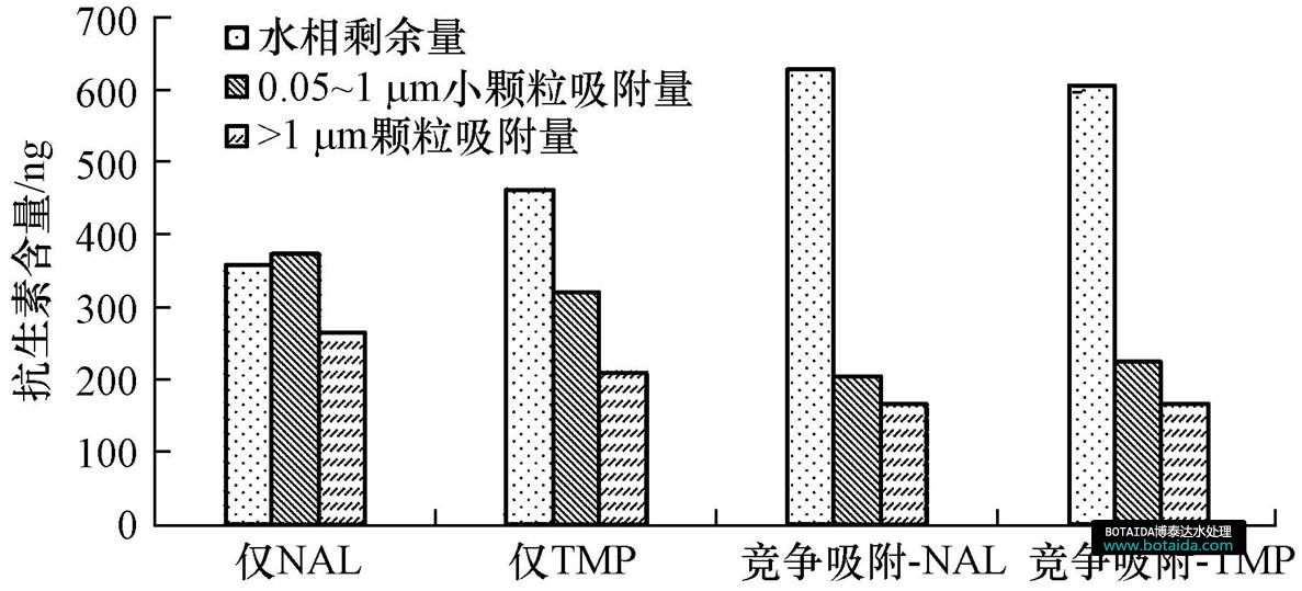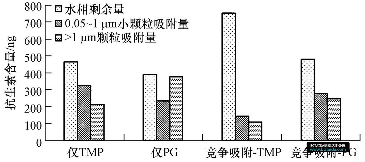 整體上,甲氧芐啶與青霉素G二者互相抑制,青霉素G對(duì)甲氧芐啶的抑制作用更明顯,特別是對(duì)于大顆粒吸附能力來(lái)說(shuō).但是,甲氧芐啶的存在卻增強(qiáng)了小顆粒對(duì)青霉素G的吸附能力.