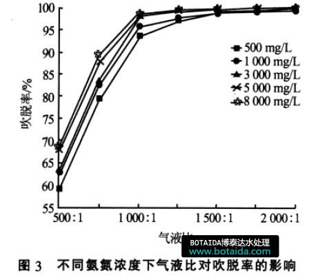 由圖3 可知,氣液比小于1 000∶1 時,不同氨氮濃度廢水的吹脫率均隨氣液比的增加顯著提高;但氣液比達(dá)到1 000∶1 時, 氨氮質(zhì)量濃度≥3 000 mg/L以上的廢水吹脫率可達(dá)95%以上; 繼續(xù)提高氣液比,吹脫率增加緩慢;而氨氮質(zhì)量濃度<3 000 mg/L的廢水吹脫率接近95%,繼續(xù)提高氣液比至1 500∶1后,吹脫率可達(dá)95%以上且增加緩慢。這表明,氣液比超過1 000∶1 后, 進(jìn)水氨氮濃度對吹脫率影響不大。實(shí)驗(yàn)中為獲得95%以上的吹脫率,應(yīng)根據(jù)進(jìn)水氨氮濃度將氣液比控制在(1 000~2 000)∶1 的范圍。