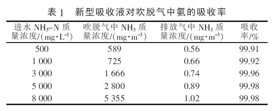 由表1 可知, 新型吸收液可高效去除不同氨氮濃度廢水吹脫氣中的氨,去除率達(dá)99.9%以上,吸收后排放氣中的氨質(zhì)量濃度最高為1 mg/m3 左右,全能滿足《惡臭污染物排放標(biāo)準(zhǔn)》(GB 14554—1993)中氨排放標(biāo)準(zhǔn)。