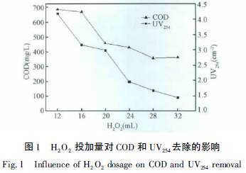 分別量取300 mL 廢水,調(diào)節(jié)廢水的pH 為4,加入到500 mL 的光化學(xué)反應(yīng)器中并加入1.6g FeSO4·7H2O 顆粒,將光化學(xué)反應(yīng)儀磁力攪拌調(diào)節(jié)到1 000 r /min,開啟磁力攪拌,使其充分溶解均勻,再分別加入12、16、20、24、28 和32 mL 的30% 的雙氧水,并同時(shí)通入臭氧,開啟光化學(xué)反應(yīng)儀反應(yīng)30min,停止反應(yīng)后取樣測(cè)定處理后水樣的COD 和UV254。COD 和UV254的變化情況如圖1 所示。