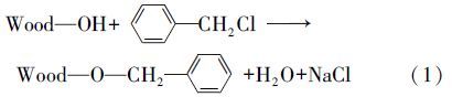 參照文獻(xiàn)(王東華等,2000)方法,在帶有攪拌機(jī)、溫度計(jì)和回流裝置的250 mL三口燒瓶中,加入20.0 g脫脂杉木粉和10% NaOH水溶液80~120 mL,攪拌均勻后讓其潤(rùn)脹 30 min,然后加入 80~120 mL氯化芐和80 mL甲苯,攪拌下于110 ℃ 油浴中加熱反應(yīng)到設(shè)定時(shí)間,冷卻并加入少量水,抽濾,分別用50 mL 50%乙醇洗滌兩次,100 mL水洗滌兩次,再用50 mL 95%乙醇洗滌兩次,抽干,在60 ℃下干燥至恒重,得芐基化杉木粉,簡(jiǎn)稱(chēng)“芐基化木粉”,轉(zhuǎn)入干燥器中,并計(jì)算增重百分率(WPG).木粉芐基化改性的化學(xué)反應(yīng)式如下: