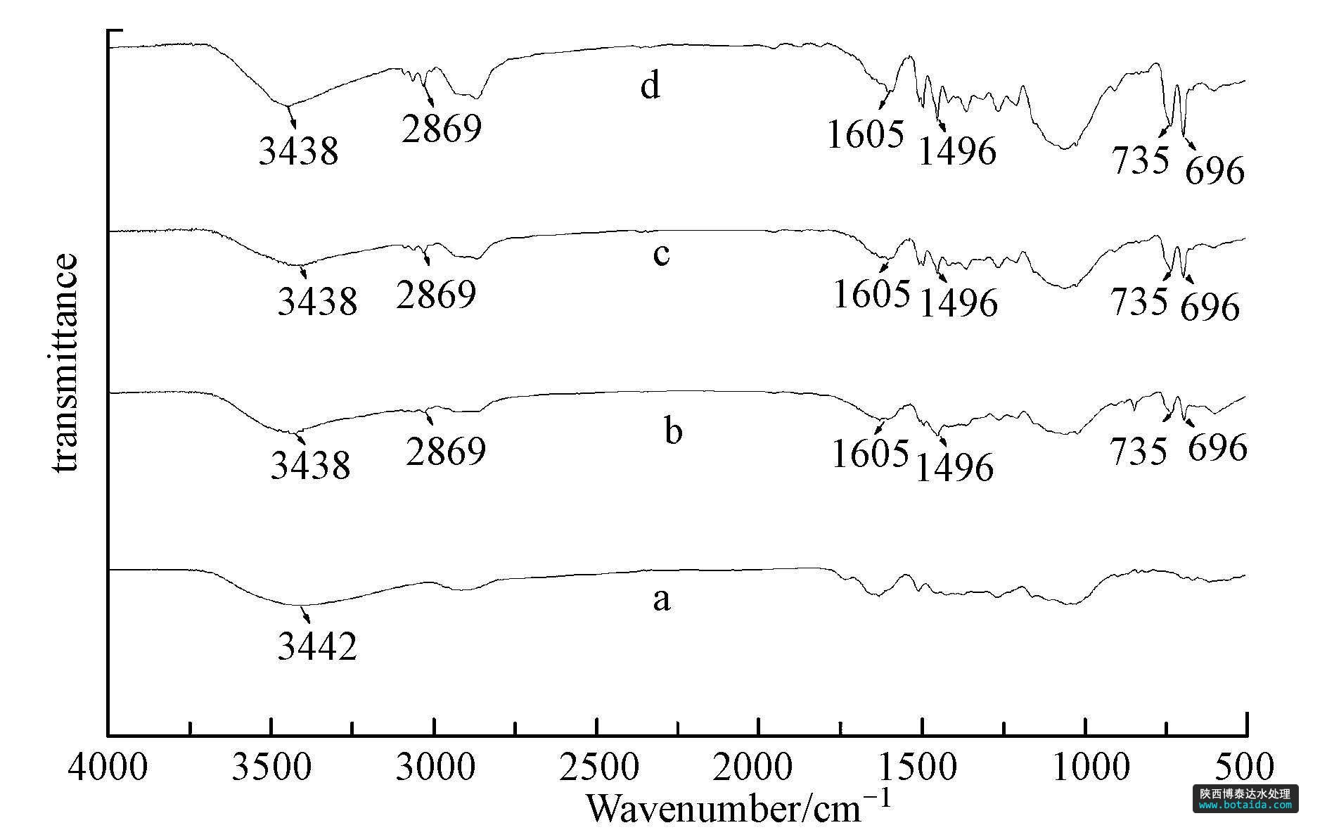 分析 采用Nicolet Avatar-330紅外光譜儀對(duì)脫脂木粉、芐基化木粉、多微孔芐基化木粉和吸附后的多微孔芐基化木粉進(jìn)行了表征(圖 1).對(duì)比原木粉(圖 1a)和芐基化木粉(圖 1b)的紅外光譜圖發(fā)現(xiàn),原木粉經(jīng)芐基化改性后,羥基振動(dòng)吸收峰由3442 cm-1移向3438 cm-1,在1605 cm-1、1496 cm-1處的兩重峰及735 cm-1、696 cm-1處的強(qiáng)吸收峰均顯示單取代苯環(huán)的特征吸收.另外,2868 cm-1處出現(xiàn)的振動(dòng)吸收峰表明了木材中的部分羥基已經(jīng)被芐基所取代.對(duì)比芐基化木粉(圖 1b)和多微孔芐基化木粉(圖 1c)的紅外光譜圖發(fā)現(xiàn),圖譜形態(tài)變化不大,無(wú)新的官能團(tuán)吸收峰出現(xiàn),表明芐基化木粉經(jīng)水熱處理后,木粉的化學(xué)組成沒(méi)有發(fā)生明顯變化.對(duì)比多微孔芐基化木粉(圖 1c)與吸附后的多微孔芐基化木粉(圖 1d)的紅外光譜圖,發(fā)現(xiàn)其吸收峰的波數(shù)基本一致,表明吸附對(duì)木粉的化學(xué)組成沒(méi)有產(chǎn)生明顯影響.