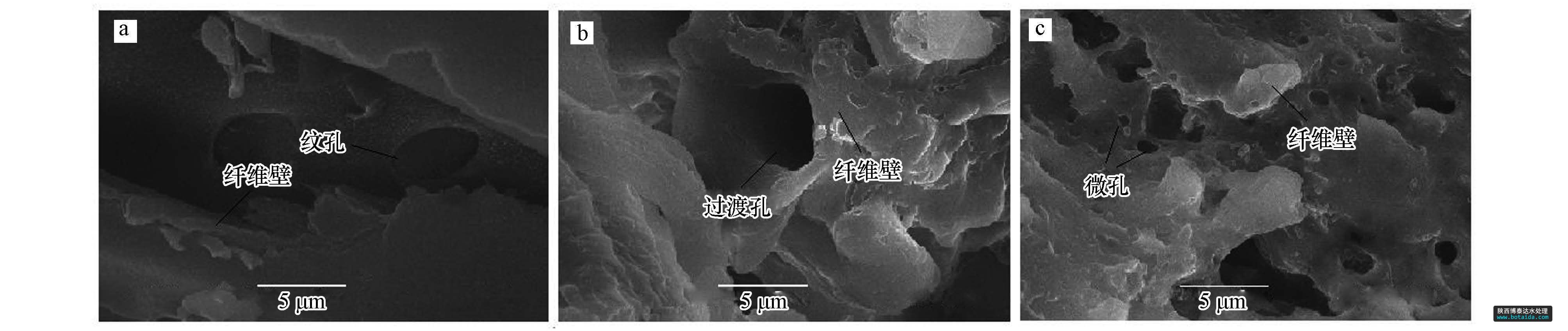 用JSM-6380LV掃描電鏡對(duì)原木粉、芐基化木粉、多微孔芐基化木粉進(jìn)行了分析(圖 4).對(duì)比原木粉(圖 4a)和芐基化木粉(圖 4b)發(fā)現(xiàn),原木粉中封閉的紋孔清晰可見(jiàn),纖維壁堅(jiān)硬、平整.原木粉經(jīng)芐基化改性后(圖 4b),紋孔膜破裂,纖維壁膨松、柔軟,過(guò)渡孔清晰可見(jiàn).芐基化木粉經(jīng)水熱處理后得到多微孔芐基化木粉(圖 4c),纖維壁明顯破裂,產(chǎn)生了許多微孔.這一方面是由于水蒸汽分子具有高能量、高穿透力,可將芐基化木粉纖維壁上的微纖絲部分沖破,并造成斷裂,產(chǎn)生新的微孔或超微孔(王瑀,2008);另一方面,在高熱水蒸汽分子沖擊下,芐基化木粉結(jié)晶區(qū)中纖維素的氫鍵斷裂,纖維分子從彎曲狀態(tài)變成伸展?fàn)顟B(tài),纖維壁伸展開(kāi)來(lái),產(chǎn)生了明顯的“膨化效應(yīng)”,有效地?cái)U(kuò)大了芐基化木粉的過(guò)渡孔和微孔.此外,水熱處理中所加乳化劑OP-10能迅速乳化從纖維壁間釋放出的膠狀物質(zhì),有利于及時(shí)清洗疏通孔道.由此可見(jiàn),木粉經(jīng)芐基化及水熱處理后,木材纖維壁變得膨松,產(chǎn)生大量的微孔或超微孔,有效地?cái)U(kuò)大了芐基化木粉吸附重金屬離子的比表面積,同時(shí)使纖維素和半纖維素分子上的羥基更加裸露,增加了對(duì)重金屬離子絡(luò)合的羥基數(shù)目,從而提高了對(duì)重金屬離子的吸附性能.