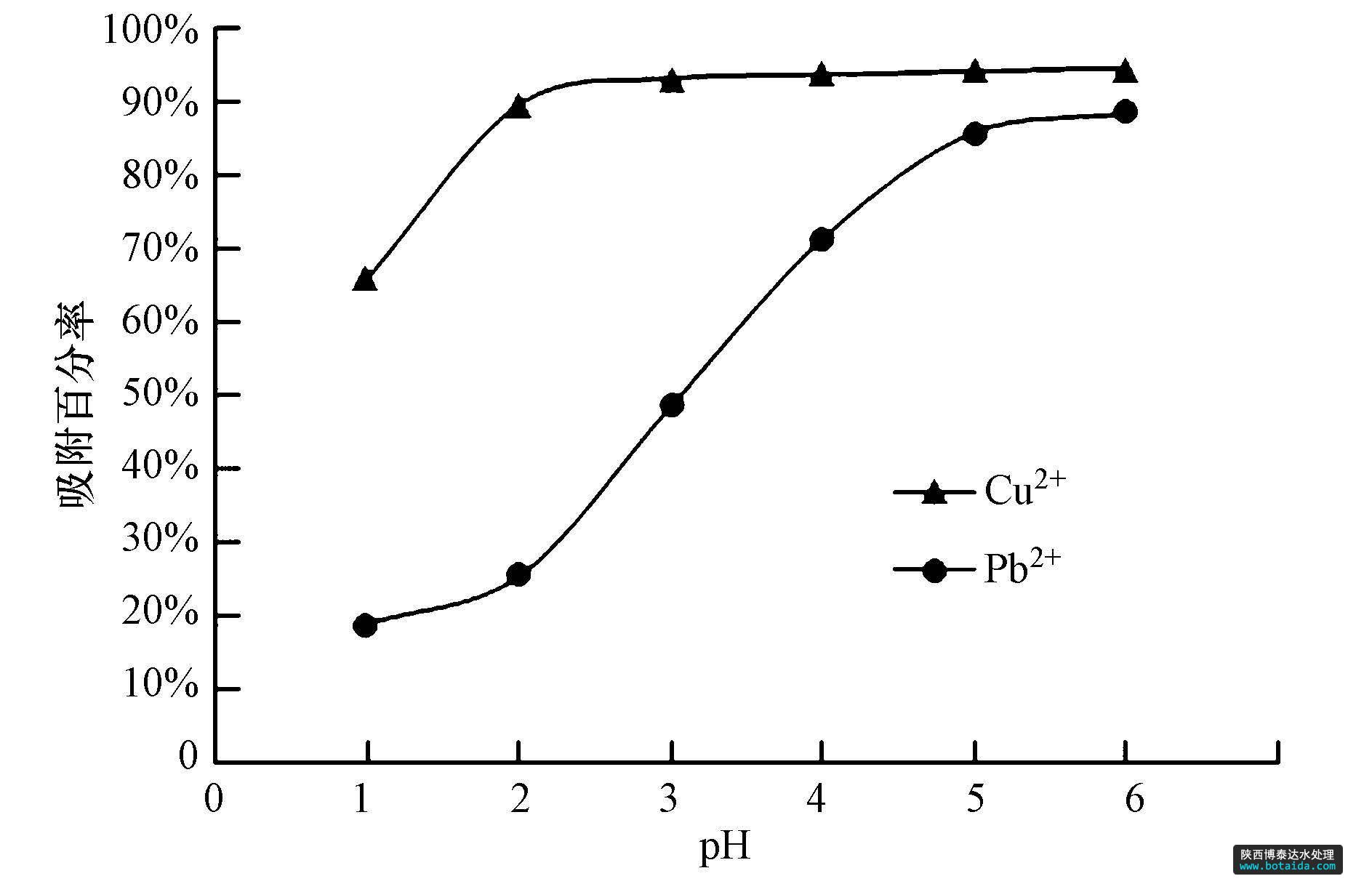 圖5 pH值對(duì)Cu2+和Pb2+吸附百分率的影響