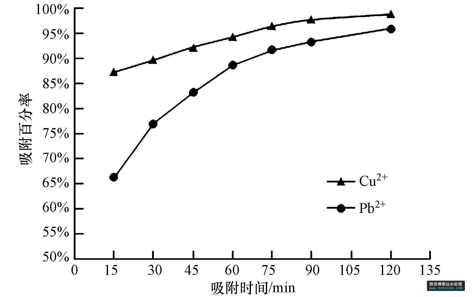 圖8 吸附時(shí)間對(duì)Cu2+和Pb2+吸附百分率的影響