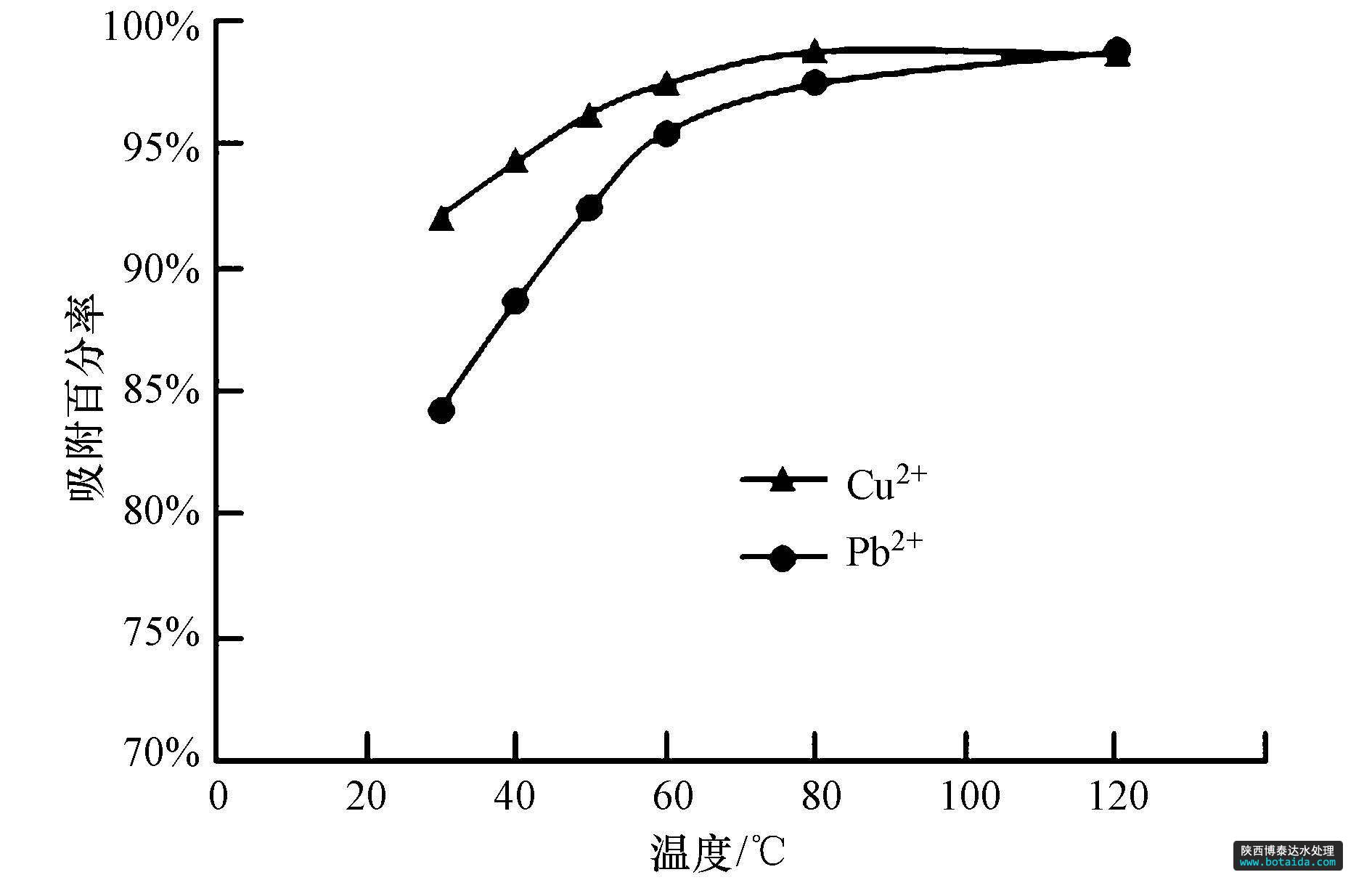 圖10 吸附溫度對(duì)Cu2+和Pb2+吸附百分率的影響