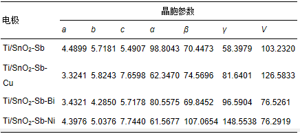 通過XRD分析軟件(X′Pert highscore plus)對數(shù)據(jù)進行分析(晉勇等,2008)得到各電極的晶胞參數(shù)見表 1,分析表中數(shù)據(jù)發(fā)現(xiàn),對Ti/SnO2-Sb電極進行金屬摻雜改性后,晶胞參數(shù)發(fā)生改變,主要體現(xiàn)在晶胞體積的增大或減小,這是由于各金屬離子成鍵半徑不同,當金屬離子以固溶或者類質(zhì)同相的形式取代Sn4+進入SnO2晶格內(nèi)部,必然引起金屬氧鍵的鍵長發(fā)生變化,從而造成晶胞參數(shù)的改變.XRD圖譜和晶胞參數(shù)等數(shù)據(jù)表明,通過金屬摻雜改性使金屬離子進入到SnO2晶格中,其中,Cu和Ni以其p型半導體的性質(zhì)形成了空穴點位(劉淼等,2013),使電極表面形成較為密集的蜂窩狀,微觀結(jié)構(gòu)(圖 1)中也觀察到電極無裂縫且蜂窩狀結(jié)構(gòu)分布均勻,這樣的結(jié)構(gòu)可以增加電極的活性點位而提高電催化性能;而Bi則為n型半導體,與SnO2有著相似的性質(zhì),進入SnO2晶格后主要通過增加自由電子的濃度來達到增強導電能力的效果.