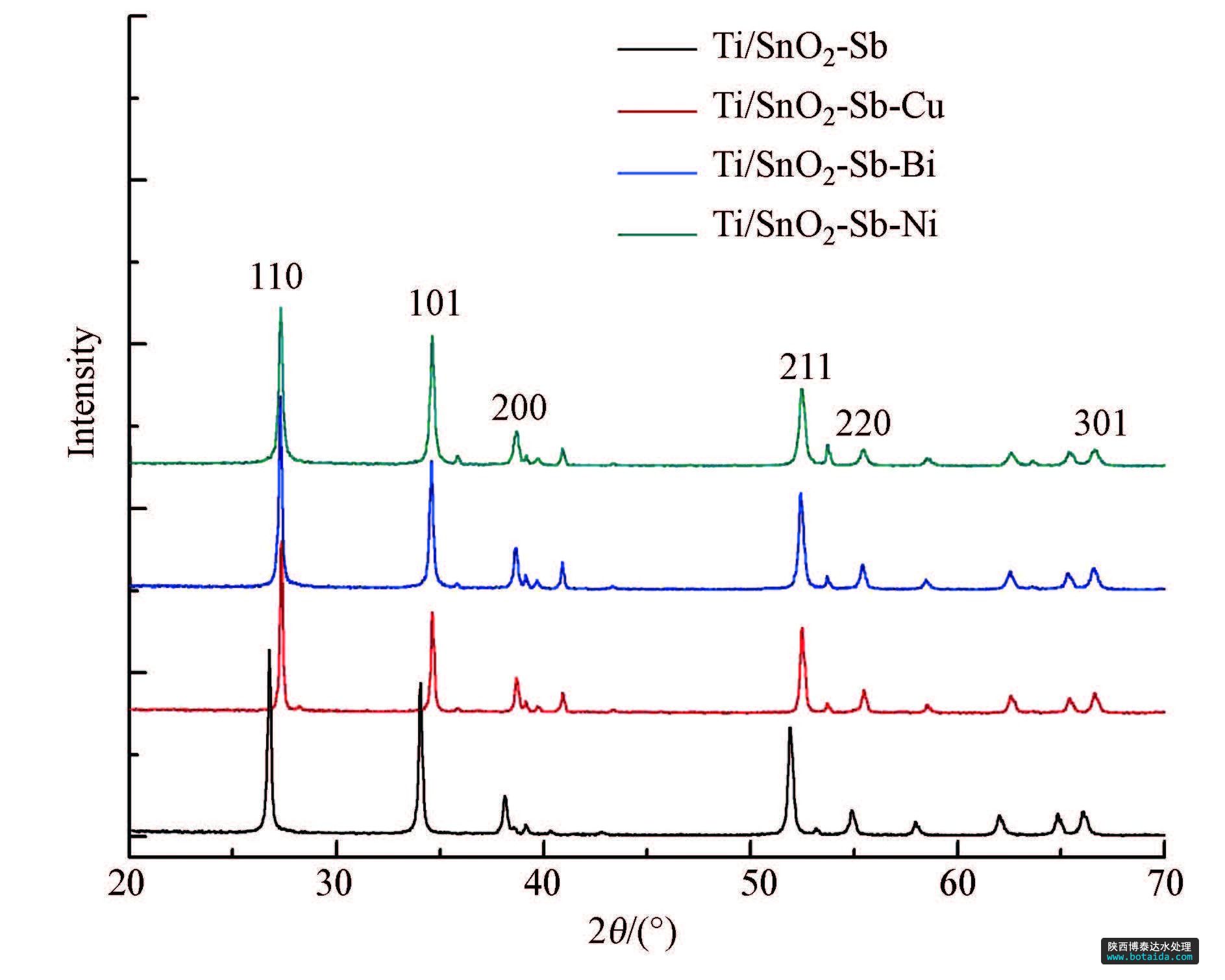 對所制備電極進行XRD分析.從圖 2數(shù)據(jù)可見,所有電極的X衍射峰的位置跟四方形金紅石型的SnO2晶體結(jié)構(gòu)的標準卡片(00-041-1445)的峰數(shù)據(jù)基本一致,并未檢測到Sb及摻雜金屬相應氧化物的衍射峰,表明金屬摻雜并沒有改變SnO2晶體結(jié)構(gòu).這可能是因為金屬離子進入SnO2的晶格中取代了晶格中Sn4+的部分位置(李子榮和張雪梅,2006),以金屬氧化物的形式固溶到SnO2的晶格中,因而在XRD中Sb及摻雜的金屬沒有以單獨的氧化物形式存在.但是摻雜金屬后電極的X射線衍射峰位置發(fā)生了微小偏移,主要由于金屬離子與被替代的Sn4+之間離子半徑存在差異,以及金屬離子加入后出現(xiàn)的氧空穴而造成晶格缺陷.