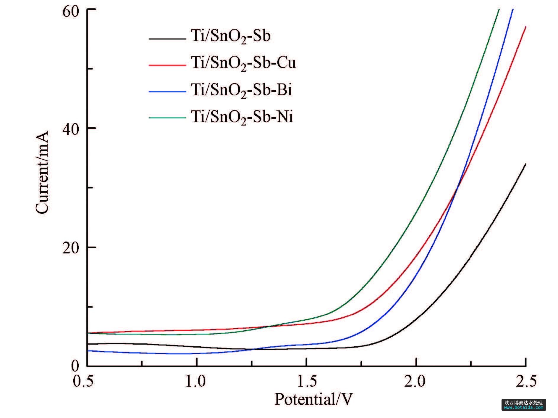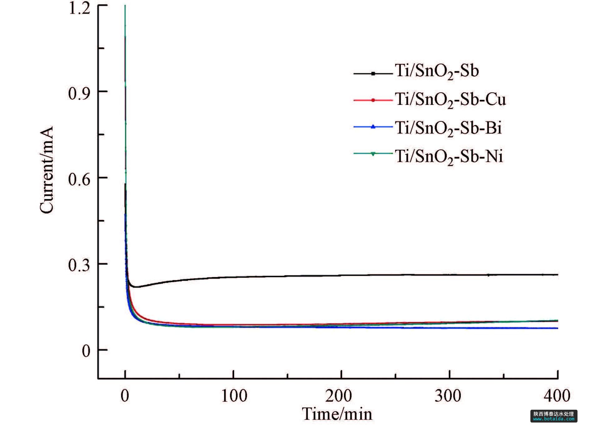 2)對各電極進行電化學性能測試得出:各電極的析氧電位均在1.7 V(vs.SCE)以上,處于較高的析氧電位,具有較高催化活性和電流效率;循環(huán)伏安測試發(fā)現(xiàn)摻雜Cu的改性電極具有最優(yōu)的催化活性;電極的電流-時間曲線表明,4種電極的氧化電流基本恒定,金屬摻雜改性后電極氧化電流明顯低于未摻雜電極,說明改性電極具有較高的穩(wěn)定性.