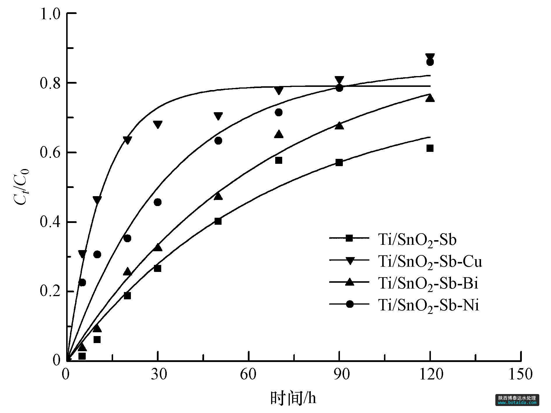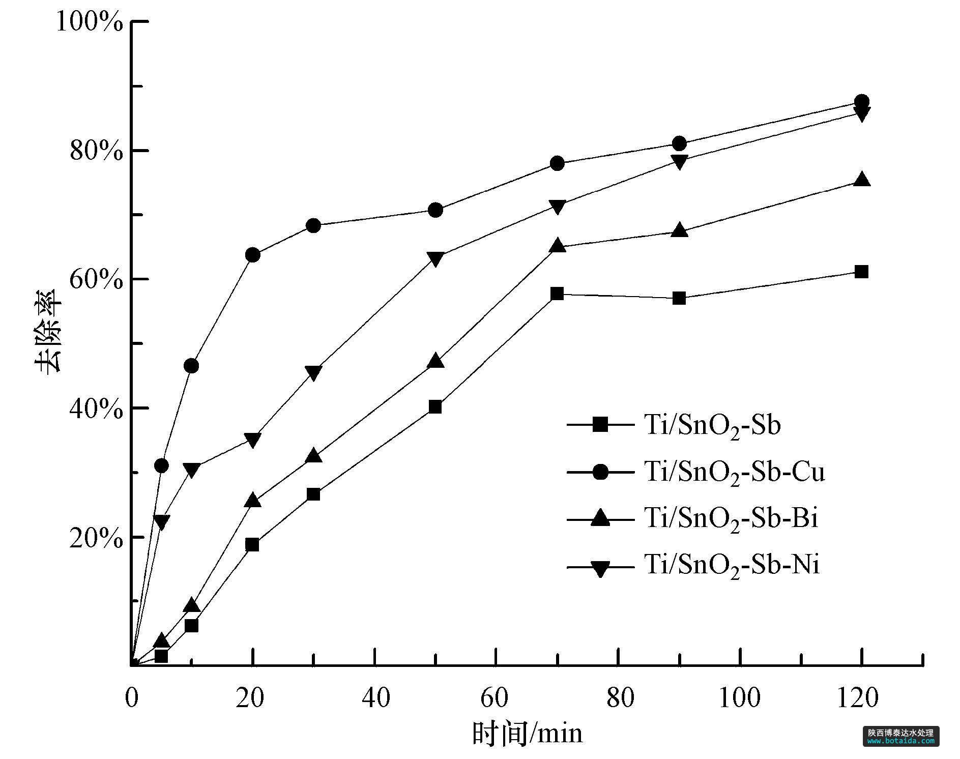 在自制電解槽中,以1,4-二氯苯為目標降解物,加入濃度為100 mg · L-1的廢水,同時添加3.55 g的Na2SO4作為支持電解質(zhì),以摻雜不同金屬的Ti/SnO2-Sb電極作陽極,石墨作陰極,通過磁力攪拌裝置控制一定的攪拌速率,恒定電壓為15 V,板間距1 cm,分別測定不同時間1,4-二氯苯的降解情況.1,4-二氯苯的測定采用高效液相色譜法.