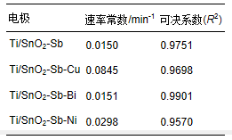 反應速率常數(shù)越大說明有機物的降解速率越快,從表中可以看出在相同條件下,p-DCB在各電極上的反應速率常數(shù)由大到小依次為KTi/SnO2-Sb-Cu,KTi/SnO2-Sb-Ni,KTi/SnO2-Sb-Bi,KTi/SnO2-Sb.因此p-DCB在Ti/SnO2-Sb-Cu電極上的降解速率最快,在Ti/SnO2-Sb電極上的降解速率最慢,可見金屬元素的摻雜對p-DCB的降解起到了促進作用。