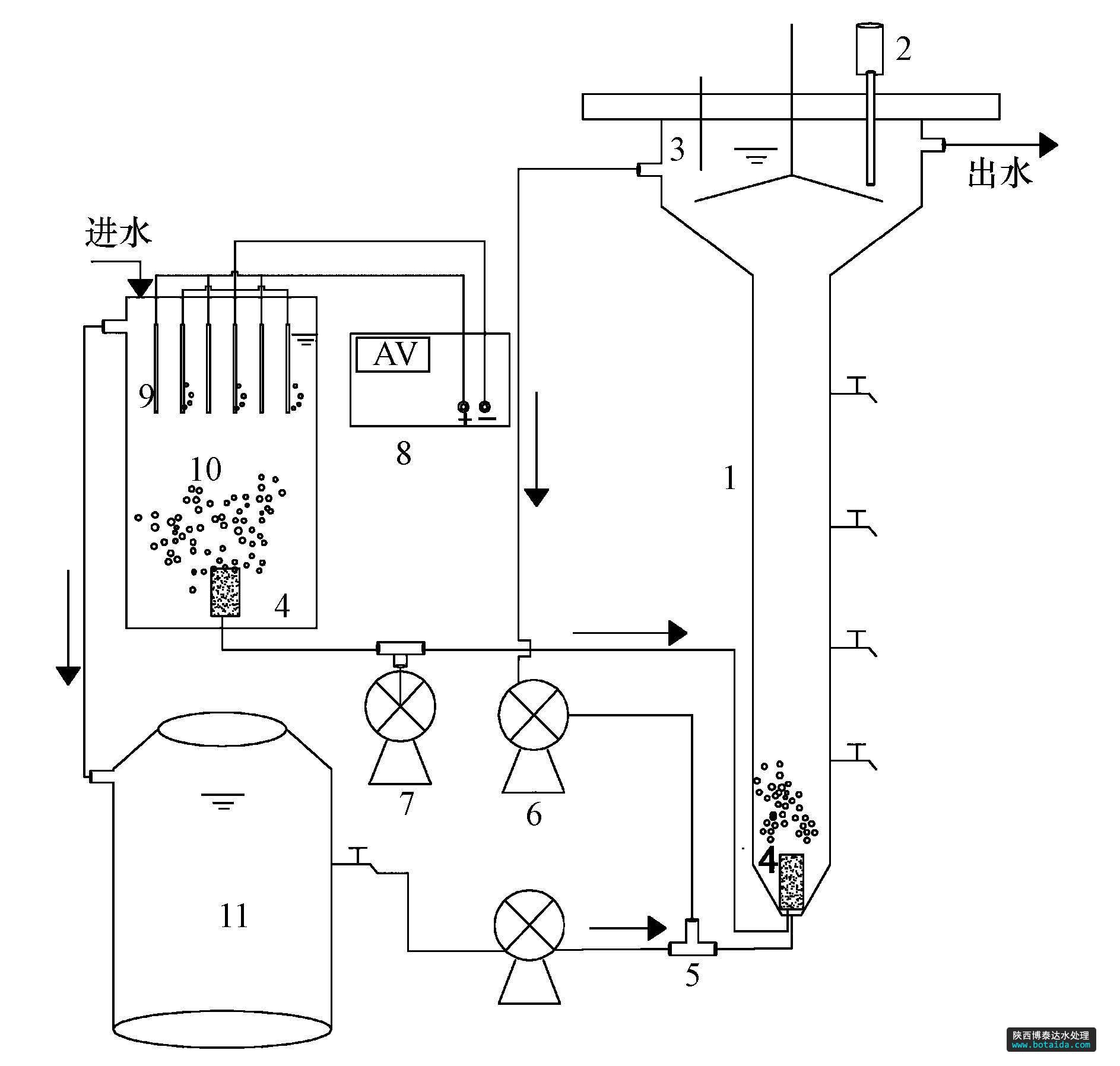 圖1 電絮凝-CANON工藝裝置示意圖(1.EGSB,2.溶解氧儀,3.溫度計,4.曝氣頭,5.三通,6.蠕動泵,7.空氣泵,8.電源,9.鋁板,10.電絮凝反應(yīng)器,11.調(diào)節(jié)池)