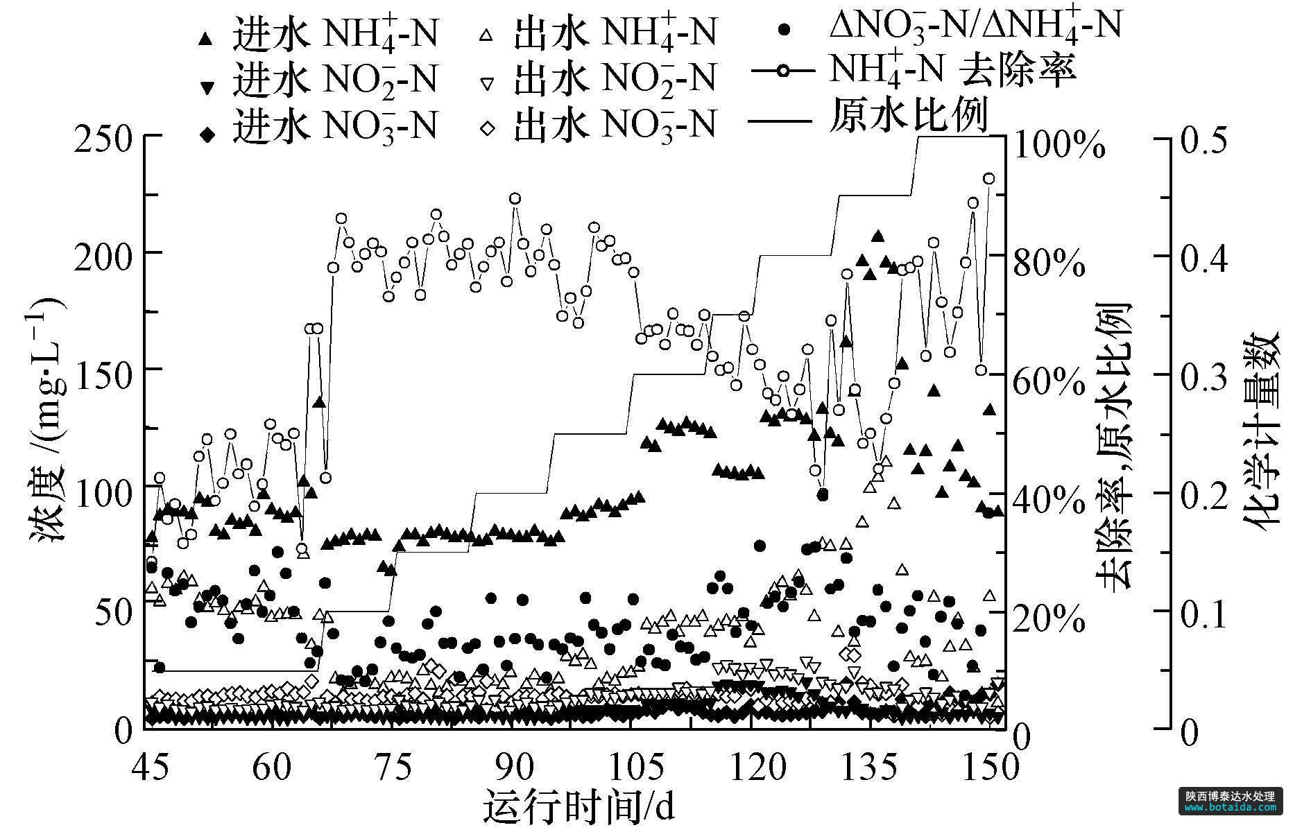 微生物馴化階段,反應(yīng)器的運行效果如圖 4所示,馴化前期(45~66 d),原水比例為10%,進水NH4+-N濃度較低(約85.0 mg · L-1),去除率在28.8%~67.6%;此階段NO2--N出現(xiàn)積累,逐漸由6.4 mg · L-1升至15.7 mg · L-1.可見在啟動前期,菌群處在調(diào)整適應(yīng)階段,ANAMMOX菌活性受到一定影響.67~105 d,原水比例由20%逐步提升至50%時,NH4+-N去除率為78.5%±7.4%,ΔNO3--N/ΔNH4+-N為(0.07±0.02),符合CANON工藝AOB和ANAMMOX協(xié)同代謝的特征.隨著原水比例的繼續(xù)提高,NO2--N無明顯的積累,NH4+-N的去除率穩(wěn)定在50.0%以上,ΔNO3--N/ΔNH4+-N在理論值0.11附近波動,說明微生物逐漸適應(yīng)環(huán)境.整個馴化過程表明,微生物的活性已經(jīng)有了較大提高,新的種群結(jié)構(gòu)已經(jīng)形成.