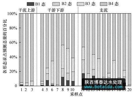 由圖 2可知,涼水河表層沉積物中各形態(tài)汞含量存在差異,在涼水河干流上游、干流下游及支流表層沉積物中均以B4態(tài)為主要賦存形態(tài),其中B4態(tài)所占比例均值分別為94.81%、69.41%和74.89%,平均百分比為75.96%;B3態(tài)所占比例均值分別為4.40%、18.40%和13.20%,平均百分比為13.70%.總體來看,在涼水河干流上游、干流下游及支流表層沉積物中,汞各形態(tài)所占比例大小順序均為B4>B3>B2>B1.涼水河表層沉積物中汞主要以B4態(tài)存在,表明涼水河表層沉積物中汞的生物可利用性低.