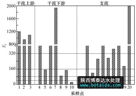 根據(jù)潛在生態(tài)風(fēng)險評價法分析涼水河表層沉積物中汞的潛在風(fēng)險情況(圖 3),并參考生態(tài)風(fēng)險等級劃分表分析涼水河表層沉積物中汞總量的潛在風(fēng)險程度.由圖可知,涼水河干流上游表層沉積物中汞的Ei范圍為951~1197,平均值為1080,潛在生態(tài)風(fēng)險程度很高;干流下游表層沉積物中汞的Ei范圍為23 ~1934,平均值為499,潛在生態(tài)風(fēng)險程度很高;支流表層沉積物中汞的Ei范圍為10~2019,平均值為456,潛在生態(tài)風(fēng)險程度很高.除個別點(采樣點10和11)處于低潛在生態(tài)風(fēng)險水平外,整體來看涼水河各個河段表層沉積物中汞的潛在生態(tài)風(fēng)險程度都處于很高的水平.