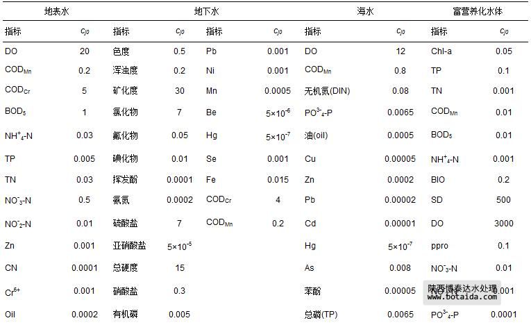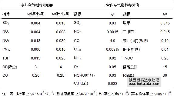 式(2)~(7)中,cj為指標(biāo)j的實(shí)測值或標(biāo)準(zhǔn)值;cj0為設(shè)定的指標(biāo)j的參照值,4類水體95項(xiàng)指標(biāo)的參照值cj0和室內(nèi)、外空氣29項(xiàng)指標(biāo)的參照值cj0分別如表 1和表 2所示.