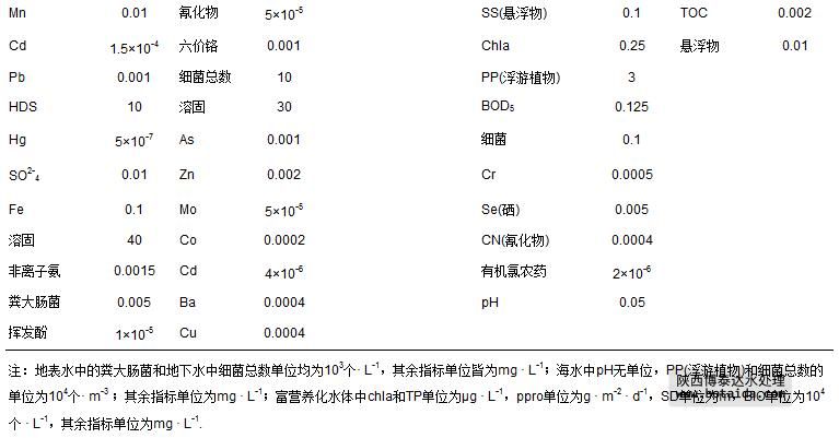 依照國家制訂的地表水環(huán)境質(zhì)量標(biāo)準(zhǔn)(GB3838— 2002)、地下水環(huán)境質(zhì)量標(biāo)準(zhǔn)(GB/14848—1993)、海水環(huán)境質(zhì)量標(biāo)準(zhǔn)(GB3097—1997)、適用于我國湖庫水體的富營養(yǎng)化標(biāo)準(zhǔn)及室外空氣環(huán)境質(zhì)量標(biāo)準(zhǔn)(GB3095—1996)和室內(nèi)空氣質(zhì)量標(biāo)準(zhǔn)(GB/T18883—2002),分別選取了4類水體的95項(xiàng)指標(biāo)(其中,地表水、地下水、海水和富營養(yǎng)化水體分別有24項(xiàng)、33項(xiàng)、23項(xiàng)和15項(xiàng)指標(biāo))和空氣的29項(xiàng)指標(biāo)(其中,室內(nèi)空氣15項(xiàng)指標(biāo)和室外空氣7項(xiàng)指標(biāo)的年、日2種不同分級標(biāo)準(zhǔn)情形)作為水環(huán)境和空氣環(huán)境的評價指標(biāo)體系.