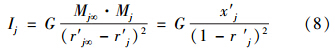 式中,Mj和Mj∞分別為指標(biāo)j的樣本“規(guī)范質(zhì)量”和“參照級”樣本“規(guī)范質(zhì)量”;r′j為指標(biāo)j的樣本的“規(guī)范坐標(biāo)”,顯然r′j=x′j;G為環(huán)境質(zhì)量引力常數(shù),其取值大小只是為了控制指數(shù)Ij的尺度范圍,對評價結(jié)果無任何影響,為簡單起見,在此取G=1.從而式(8)可表示為: