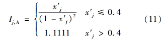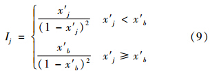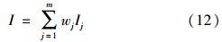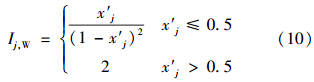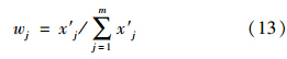 式中,Ij為由式(10)或式(11)計算得到的指標(biāo)j的引力指數(shù)值;wj為指標(biāo)j的歸一化權(quán)值,即滿足∑ m j=1 wj=1,它可以視實(shí)際問題需要,采用某種方法確定.一般情況下,只要各指標(biāo)的規(guī)范值x′j差異不大,可視各指標(biāo)為等權(quán)即可;但若最大指標(biāo)規(guī)范值x′j,max與最小指標(biāo)規(guī)范值x′j,min差異較大,則可采用如式(13)所示的對各指標(biāo)規(guī)范值x′j的線性加權(quán)計算權(quán)值.