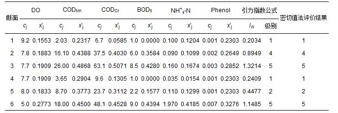 2008年圖們江干流6個斷面的6項(xiàng)地表水水質(zhì)指標(biāo)監(jiān)測數(shù)據(jù)cj(唐立新等,2010),以及由式(1)和式(2)計算得到的指標(biāo)規(guī)范值x′j如表 5所示.對斷面2和3,采用式(13)對引力指數(shù)值進(jìn)行加權(quán)計算;其余斷面在視指標(biāo)為等權(quán)的情況下,用式(10)和式(12)計算得到各監(jiān)測點(diǎn)水質(zhì)引力綜合指數(shù)值,并根據(jù)表 3中3類陸地水體的引力綜合指數(shù)值的分級標(biāo)準(zhǔn)做出水質(zhì)類別判斷結(jié)果(表 5).表 5中還列出了參考文獻(xiàn)(唐立新等,2010)中用密切值法作出的評價結(jié)果.可以看出,利用引力普適指數(shù)公式和用密切值法對6個斷面水質(zhì)做出的評價結(jié)果,完全一致.