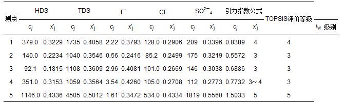 豐縣5個監(jiān)測點(diǎn)的5項(xiàng)地下水指標(biāo)監(jiān)測數(shù)據(jù)cj(劉洪等,2009),以及由式(1)和式(3)計算得到的指標(biāo)規(guī)范值x′j如表 6所示.在視各指標(biāo)為等權(quán)情況下,用式(10)和式(12)計算得到各監(jiān)測點(diǎn)水質(zhì)引力綜合指數(shù)的指數(shù)值,并根據(jù)表 3中3類陸地水體的綜合指數(shù)值分級標(biāo)準(zhǔn)做出水質(zhì)類別判斷結(jié)果(表 6).表中還列出文獻(xiàn)(劉洪等,2009)中用多屬性決策分析法(TOPSIS)做出的評價結(jié)果,可以看出,2種方法做出的評價結(jié)果完全一致.