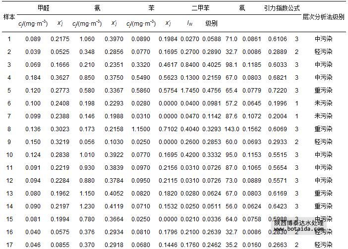 2002年11—12月長春市30個室內(nèi)樣本5項(xiàng)指標(biāo)監(jiān)測數(shù)據(jù)cj(湯紅巖等,2005),以及由式(1)和式(7)計算出的指標(biāo)規(guī)范值x′j如表 11所示.由于樣本1、11~15、26和27的不同指標(biāo)計算得到的規(guī)范值相差較大,因此,在用式(12)計算引力綜合指數(shù)時,需用式(13)對引力指數(shù)值進(jìn)行加權(quán)計算,其余22個樣本的指標(biāo)視作等權(quán),計算得到各樣本引力綜合指數(shù)值,并根據(jù)表 3中空氣環(huán)境質(zhì)量引力指數(shù)分級標(biāo)準(zhǔn)做出評價結(jié)果(表 11).表中還列出文獻(xiàn)(湯紅巖等,2005)中用層次分析評價法做出的評價結(jié)果.由于文獻(xiàn)(湯紅巖等,2005)中的層次分析評價法將室內(nèi)空氣污染劃分為清潔(1*級)、未污染(2*級)、輕污染(3*級)、中污染(4*級)和重污染(5*級)等5級;而本文引力指數(shù)法將其劃分為1級、2級、3級.二者對應(yīng)關(guān)系為:(1*級清潔、2*級未污染)對應(yīng)1級,(3*級輕污染)對應(yīng)2級,(4*級中污染、5*級重污染)對應(yīng)3級.由表 11可以看出,二種方法評價結(jié)果完全一致.