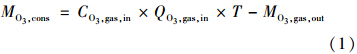 式中,MO3,cons為臭氧消耗量(mg);CO3,gas,in為反應(yīng)器入口的臭氧濃度(mg · L-1);QO3,gas,in為臭氧氣體流速(L · min-1),由氣體流量計(jì)測得;T為活性污泥臭氧氧化時(shí)間(min);MO3,gas,out為未參與反應(yīng)的臭氧量(mg).