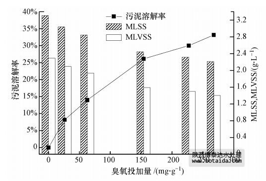 首先考察了不同臭氧投加量對(duì)污泥溶解率的影響.如圖 1所示,隨著臭氧投加量的增加,污泥的MLSS和MLVSS逐漸減小,污泥溶解率逐漸增大.當(dāng)臭氧投加量在0~154 mg · g-1時(shí),溶解率增加較快,由0增加到26%;當(dāng)臭氧投加量在154~268 mg · g-1時(shí),污泥溶解率增加較慢,由26%增加到33%.為了在獲得較好污泥減量效果的同時(shí)盡可能降低污泥臭氧處理的成本,建議合理的臭氧投加量為150 mg · g-1左右.