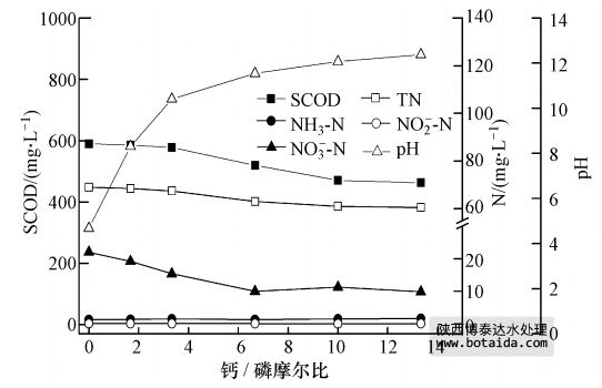 選用Ca(OH)2作為除磷劑,分別考察了不同鈣磷摩爾比(1.7、3.3、6.7、10.0、13.3)和對(duì)臭氧處理后污泥上清液的除磷效果以及SCOD、氮、pH的影響.