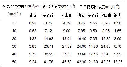 準(zhǔn)確稱取沸石、空心磚、火山巖(沸石、空心磚、火山巖、鋼渣)1 g于100 mL的錐形瓶中,分別準(zhǔn)確加入NH+4-N(磷)濃度為0、5、10、20、30、40、50 mg · L-1的NH4Cl(KH2PO4)溶液50 mL,加入2滴氯仿以防止微生物活動(dòng).將樣品置于水浴恒溫振蕩器中,在150 r · min-1、25 ℃的條件下,振蕩時(shí)間24 h,取出樣品測定NH+4-N(磷)濃度,計(jì)算吸附量.實(shí)驗(yàn)在相同條件下設(shè)置3平行.