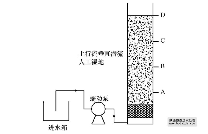試驗(yàn)裝置模擬上行流垂直潛流人工濕地,裝置直徑15 cm,高100 cm,填料層高度80 cm,底部填充10 cm厚的礫石為布水區(qū)(圖 1).填料柱采用蠕動(dòng)泵進(jìn)水,進(jìn)水以松花江富錦段微污染江水水質(zhì)為依據(jù)配水,水質(zhì)為COD 80~100 mg · L-1,NH+4-N 10~13 mg · L-1,NO-3-N 13~15 mg · L-1,TP 1.5~2.5 mg · L-1.水力負(fù)荷為2.65 mL · min-1,運(yùn)行時(shí)間為20周.系統(tǒng)穩(wěn)定運(yùn)行后,對填料層的不同深度進(jìn)行分析,考察不同填料段污染物在濕地中去除的規(guī)律,在填料20、40、60、80 cm處分別設(shè)置取樣口,編號分別為A(0~20 cm)、B(20~40 cm)、C(40~60 cm)、D(60~80 cm).
