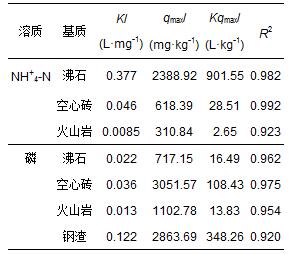 Langmuir等溫吸附模型中的K值為吸附結(jié)合能,K值越大,表示填料與溶質(zhì)的結(jié)合越穩(wěn)定.從表 4可以看出,各填料與NH+4-N之間的結(jié)合能大小順序?yàn)榉惺?gt;空心磚>火山巖;各填料與磷之間的結(jié)合能大小順序?yàn)殇撛?gt;空心磚>沸石>火山巖.Kqmax為最大緩沖容量,反映固液體系吸附溶質(zhì)時(shí)的緩沖能力(趙桂瑜,2007).將各填料進(jìn)行比較,對NH+4-N緩沖容量最大的填料為沸石,對磷緩沖容量最大的為鋼渣,空心磚次之.這說明即使溶液污染物濃度變化較大時(shí),這些填料對相應(yīng)污染物仍能維持較好的去除效果.因此,沸石是較好凈化NH+4-N,鋼渣、空心磚是較好的凈化磷的人工濕地填料.