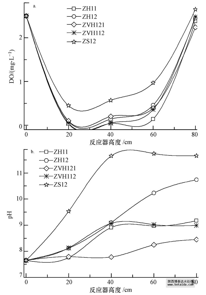 運(yùn)行穩(wěn)定后,反應(yīng)器中不同填料段DO與pH的變化如圖 2所示.DO在各反應(yīng)器分布趨勢基本相似,在各段的數(shù)值上存在差異.DO在不同填料段的濃度具有明顯的空間特征,導(dǎo)致反應(yīng)器在不同段形成了厭氧、缺氧、好氧交替的環(huán)境,這對微生物的生物降解、硝化、反硝化作用具有較大的影響.在各反應(yīng)器底部20 cm處DO濃度均在0.5 mg · L-1以下,ZH11、ZH12、ZVH112、ZVH121的填料組合方式中,底部DO濃度達(dá)到了0.2mg · L-1以下.這說明當(dāng)污水進(jìn)入反應(yīng)器后,DO被迅速消耗,在各反應(yīng)器0~40 cm間形成了一個(gè)厭氧環(huán)境.同時(shí)隨著反應(yīng)器高度的增加,反應(yīng)器中DO濃度有所升高,在反應(yīng)器頂端接觸空氣處達(dá)到最大值,各反應(yīng)器頂部80 cm處的DO濃度維持在2.24~2.65 mg · L-1之間,這是由于大氣復(fù)氧導(dǎo)致DO濃度的升高.同時(shí),由于該處污水可生化性已經(jīng)較差,污染物不再耗氧分解.