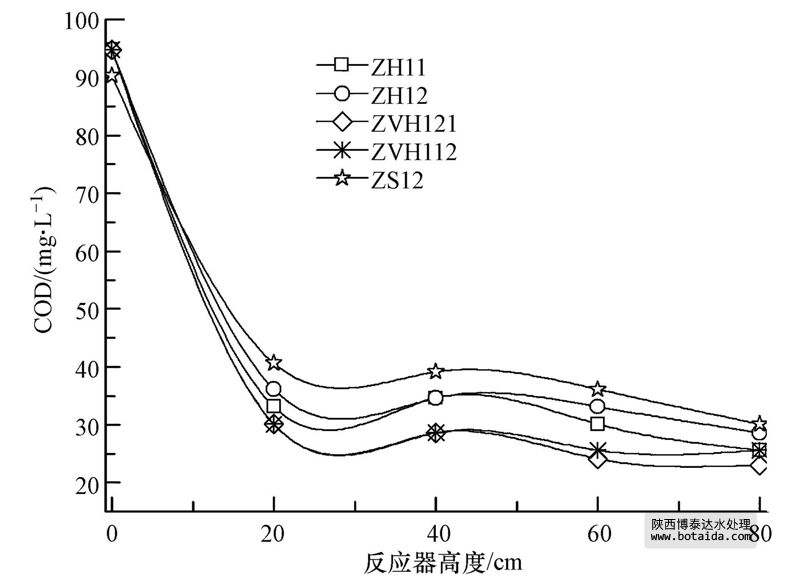 圖 5為NO-3-N在反應(yīng)器豎直方向上分布情況,NO-3-N在反應(yīng)器0~40 cm處得到大部分的去除,40~80 cm處去除量較少.這是因?yàn)?~40 cm間較低的DO為微生物反硝化提供了一個(gè)良好的厭氧環(huán)境,同時(shí)COD在此段的大量降解為微生物反硝化提供了電子,致使反硝化菌在此段活性較高,反硝化作用較強(qiáng).