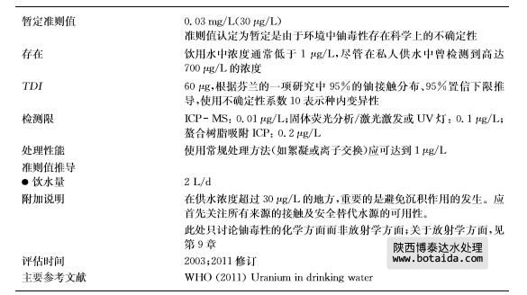 根據(jù)人群接觸高濃度鈾的新的流行病學研究推導的30μg /L的暫定準則值,代替原先 根據(jù)實驗動物研究推導的暫定準則值。被認定為是基于有關(guān)鈾的毒理學和流行病學上的不 確定性以及要實現(xiàn)更低濃度供應在技術(shù)上的困難度。要注意的是,有關(guān)人類群體的研究如 可獲取且質(zhì)優(yōu),則為用于推導健康準則值相關(guān)信息的首選來源