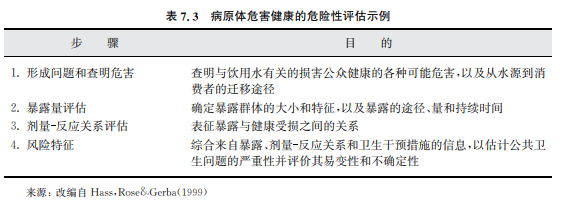 風(fēng)險評估、包括QMRA,首先從提出問題開始,其目的是確定各種可能的危害及危 害從源頭到消費者的各種遷移路徑。然后,將人接觸病原體的情況(環(huán)境濃度及攝入 量)和所選(或參考)生物體的劑量 反應(yīng)關(guān)系綜合起來以描繪出風(fēng)險的特征。結(jié)合其他 信息(社會、文化、政治、經(jīng)濟(jì)、環(huán)境等)就可提出一些優(yōu)先選用的管理辦法。為鼓勵利 益相關(guān)各方的支持和參與,在處理過程的每一階段,都能做到透明并主動溝通有關(guān)危險 性的信息是非常重要的。表7.3給出了危險性評估的一個例子并在下面進(jìn)行詳細(xì) 描述。