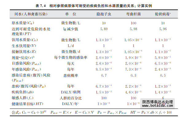 當(dāng)需將一個病例中發(fā)生特定疾病的風(fēng)險轉(zhuǎn)化為疾病負(fù)擔(dān)時,可以使用DALY(metric disabilityadjustedlifeyear)(見第3章3.1)。這不但反映了急性終點反應(yīng)(腹瀉),也反映了 死亡率和更嚴(yán)重的終點反應(yīng)(如與彎曲桿菌有關(guān)的格林 巴利綜合癥,即急性感染性多發(fā)神 經(jīng)炎)。每個病例的疾病負(fù)擔(dān)變化很大。例如,每1000例輪狀病毒的疾病負(fù)擔(dān)在低收入地 區(qū)為480DALYs,而且還經(jīng)常發(fā)生兒童死亡。但在大多數(shù)居民都能得到醫(yī)療救助的高收入 地區(qū)僅為14DALYs/1000例(見附錄1支持性文件《世界衛(wèi)生組織飲用水水質(zhì)準(zhǔn)則中公共 衛(wèi)生風(fēng)險量化》)。由于這種疾病負(fù)擔(dān)上的明顯差別,為了要達(dá)到相同的危險程度(以 DALYs/人/年表示),在相同水源質(zhì)量的情況下,在低收入地區(qū)就需要實施更嚴(yán)格的水處 理。表7.4中10-6DALY/人/年這樣的健康結(jié)果目標(biāo)最好能與具體國情相結(jié)合。表7.4中 沒有免疫缺陷人群的計算數(shù)值(如 HIV/AIDS患者中的隱孢子蟲?。谀承﹪?,這些人群的數(shù)量還是很多的。3.2節(jié)中有更多關(guān)于DALY的信息,及關(guān)于如何將其用于獲取風(fēng)險 參考值。