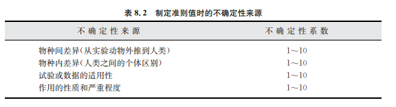 涉及一般人群的接觸劑量時(shí),以動(dòng)物實(shí)驗(yàn)臨界效應(yīng)得出的犖犗犃犈犔或犅犕犇/犅犕犇犔通 常要除以不確定性系數(shù)100。這里還有兩個(gè)10倍系數(shù),其一是物種間差異,另一個(gè)是人群中 個(gè)體間差異(見表8.2)。另外的不確定性系數(shù)還可能來自數(shù)據(jù)資料的不足和有害作用的嚴(yán) 重性和不可逆性。