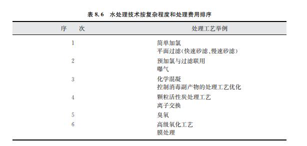 不同水處理工藝按其復(fù)雜程度和處理費(fèi)用的定性排序如表8.6所示,次序越高,工藝或 運(yùn)營(yíng)越復(fù)雜。同時(shí),通常來說也意味著更高的處理費(fèi)用。
