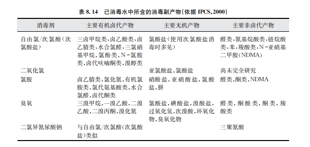 在水處理過程中,有些物質(zhì)是人為添加進入水體的(直接添加物),有些物質(zhì)可能不受控 制地殘留在出水中(如鹽類、高分子絮凝劑殘留物或單體)。類似氯胺或自由氯的殘留屬于 有意添加,這些殘留對水質(zhì)保障有一定好處。其他物質(zhì),如消毒副產(chǎn)物,是在消毒劑與水中 通常存在的一些物質(zhì)相互起化學反應過程中產(chǎn)生的(見表8.14)。氯化消毒副產(chǎn)物和其他消 毒副產(chǎn)物也可能會在游泳池用水中出現(xiàn),此時吸入和皮膚吸收途徑對人體接觸消毒副產(chǎn)物 更加重要(WHO,2006)。