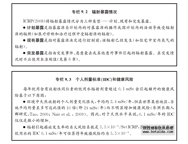 輻射防護(hù)基于任何輻射途徑都會造成一定風(fēng)險(xiǎn)的假定。在長期時(shí)間內(nèi)攝取含有放射性 同位素的飲用水屬于長時(shí)間輻射暴露的一種。有數(shù)據(jù)表明輻射活度大于100mSv,人類致 癌風(fēng)險(xiǎn)明顯增加(Brenneretal.,2003)。在這個(gè)劑量以下,現(xiàn)有流行病學(xué)研究不足以證明 致癌風(fēng)險(xiǎn)增加。目前,將暴露量和風(fēng)險(xiǎn)假定為線性關(guān)系,且沒有無風(fēng)險(xiǎn)的閾值。由于暴露量 在0.1mSv/年時(shí)不會造成可檢測到的不良健康效應(yīng),因此將此值設(shè)為個(gè)人劑量標(biāo)準(zhǔn)(IDC)。