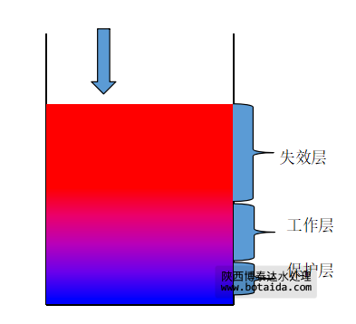 當(dāng)水流首先接觸的上層交換劑失效后,繼續(xù)進(jìn)入的原水就與下一層交換劑進(jìn)行離子交換,從而使工作層不斷下移。整個(gè)交換劑層便分為三個(gè)區(qū)域。隨著交換劑的運(yùn)行,失效層的區(qū)域不斷增大,工作層不斷下移,未交換區(qū)域隨之減少。