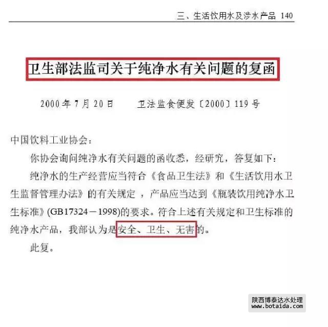 2000年7月20日,衛(wèi)生部衛(wèi)生法制與監(jiān)督司在給中國(guó)飲料工業(yè)協(xié)會(huì)的復(fù)函中說,純凈水“是安全,衛(wèi)生,無害的”。