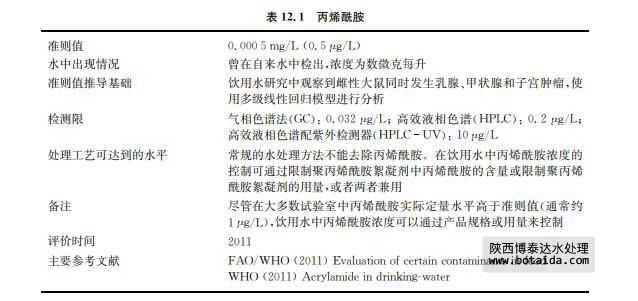用聚丙烯酰胺絮凝劑處理飲用水時(shí)會(huì)造成丙烯酰胺單體的殘留(見表12.1)。通常,水 中該聚合物的最大允許用量為1mg/L。當(dāng)聚合物中單體的含量占0.05%時(shí),水中相對應(yīng)的單體最大的理論濃度相當(dāng)于0.5μg/L。實(shí)際使用中,濃度可能比上述還要低2~3倍。這個(gè) 濃度適用于陰離子和非離子聚丙烯酰胺,而陽離子聚丙烯酰胺中單體的殘留水平可能會(huì)高 些。聚丙烯酰胺還可以用作建造飲用水蓄水池和水井的灌漿劑。人對其的攝入源于食物的 可能性多于源于飲用水:由于食物加工過程使用聚丙烯酰胺,而高溫烹調(diào)食物(例如面包、 油炸的和烤的食物)可能生成丙烯酰胺單體。