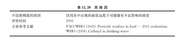 西維因(CASNo.63 25 2)是一種用于控制農(nóng)作物、樹木和觀賞植物害蟲的廣譜氨基 甲酸酯類殺蟲劑,它在公共衛(wèi)生和獸醫(yī)實(shí)踐中也有一些用途(見表12.20)。尚未有報(bào)道證明 飲用水中含有西維因,但它可能會經(jīng)滲流和噴灑進(jìn)入地表水。因此,除非在特殊情況下,通 過飲用水的接觸量是非常低的。普通人群中,攝入西維因的主要途徑是食物,但殘余量認(rèn)為 相對較低.
