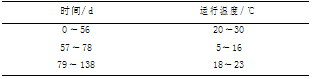 反應器每天運行 4 個周期,每個周期 6 h,分為: 進水 10 min,厭氧 80 min,好氧 210 min,沉淀 ( 30 ~ 3) min( 沉淀時間在顆粒培養(yǎng)階段逐漸由 30min 遞減至 3 min,顆粒成熟之后保持 3 min) ,排水 10 min,剩余時間閑置,反應器換水比為 75% . 運行過程中對 pH 不做控制,控制曝氣流量為 1. 50L·min - 1 ,運行溫度變化如表 1 所示.