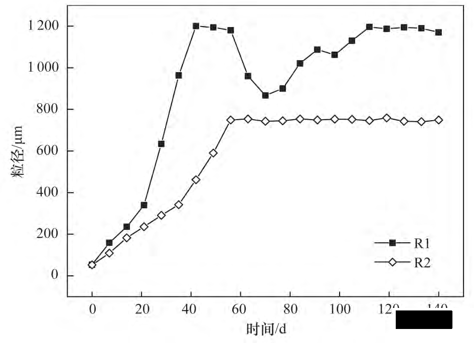 R1、R2 分別以人工配水和實際生活污水為進水,接種污水處理廠普通絮狀活性污泥,采取逐漸縮短沉淀時間的方式培養(yǎng)好氧顆粒污泥. R1、R2分別在第 20 d、35 d 時,出現(xiàn)細小顆粒,如圖 2 所示,分別歷時 25 d、42 d 后,顆粒污泥的平均粒徑達到 340 μm,好氧顆粒污泥工藝啟動成功. 顆粒污泥穩(wěn)定后,其平均粒徑分別達到1 200 μm、750μm. 有研究表明進水有機負荷是好氧顆粒污泥形成的重要影響因素,有機負荷較低,微生物生長速率減慢,不利于顆粒化. 人工配水中的有機物易被微生物吸收利用,而實際生活污水水質成分復雜,由易生物降解物質、慢速生物降解物質和溶解性惰性物質組成,其中,溶解性惰性物質包含不可生物降解的 COD 組分,生活污水中能被微生物利用的有機負荷較人工配水少,故 R2 相對R1 污