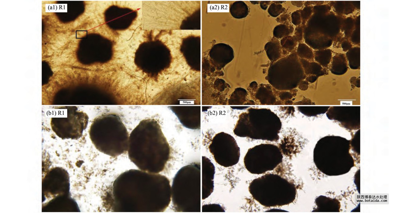 ( a1) R1 和( a2) R2 為 70 d 的顯微鏡照片,( b1) R1 和( b2) R2 為 130 d 的顯微鏡照片圖 3  R1 和 R2 反應器中顆粒污泥的顯微鏡照片