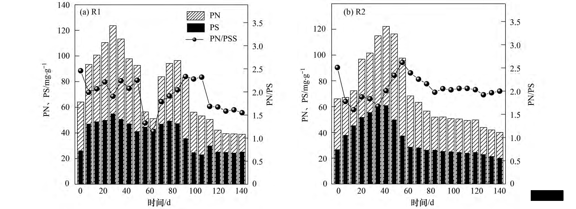 胞外聚合物( EPS) 主要由蛋白質( PN) 和多糖 ( PS) 組成,在污泥顆粒化過程中具有重要作 用. 如圖4 所示,PN、PS 在顆粒污泥啟動階段 ( 0 ~ 25 d 和 0 ~ 42 d) 整體呈上升趨勢,R1、R2 內(nèi)的 PN 含量( 以 MLSS 計) 分別由初始的 64. 12mg·g - 1 、65. 98 mg·g - 1 增 加 到 最 大 值 123. 65mg·g - 1 、122. 19 mg·g - 1 ,PS 含量分別由初始的26. 08 mg·g - 1 、26. 59 mg·g - 1 增加到最大值 64. 89mg·g - 1 、62. 13 mg·g - 1 . PS 越高,污泥表面親水性越強,PN 增加,污泥疏水性增強,細菌之間的黏附性能也隨之增加,有利于顆粒污泥的形成. R1 中微生物可利用的有機負荷較高,刺激微生物產(chǎn)生更多的EPS,故顆粒形成時間較短. 在實驗進行的第 57 ~ 78 d,由于室內(nèi)溫度較低( 5 ~ 16℃ ) ,R1 中PN 含量減少至 51. 15 mg·g - 1 ,細胞表面的疏水性減弱,不利于微生物相互黏附,顆粒解體,而生活污水中含有一定的蛋白質,與顆粒污泥接觸時可被絮凝吸附,故 R2 中PN 含量受溫度影響較小.